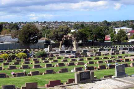 At right: Highton Cemetery 27 August 2005 - 2nd row from front, 4th headstone from left.
